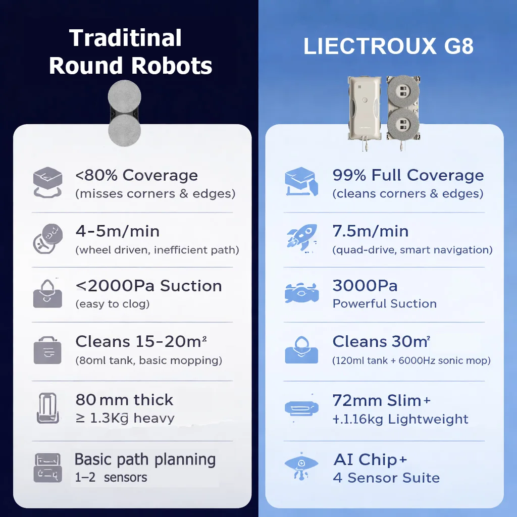 Liectroux G8 on moderni ikkunanpesurobotti, joka on suunniteltu helpottamaan ikkunoiden, peilien ja muiden sileiden lasipintojen puhdistusta. Laite käyttää nopeaa suoraviivaista puhdistusliikettä ja kaksisuuntaista vesisuihkutusta, joiden tarkoitus on parantaa puhdistustulosta ja helpottaa arjen lasipintojen ylläpitoa.